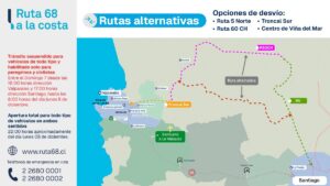 Los vehículos que deban circular por la Ruta 68 entre la Región de Valparaíso y la ciudad de Santiago, deberán tomar como alternativas Ruta 5 Norte vía La Calera, o por Cuesta La Dormida.